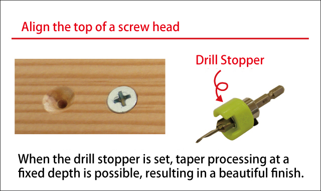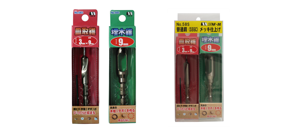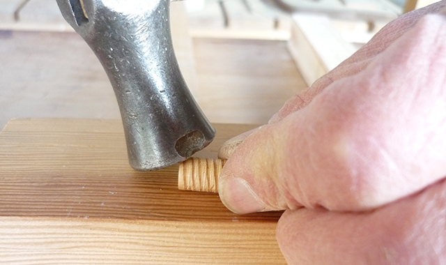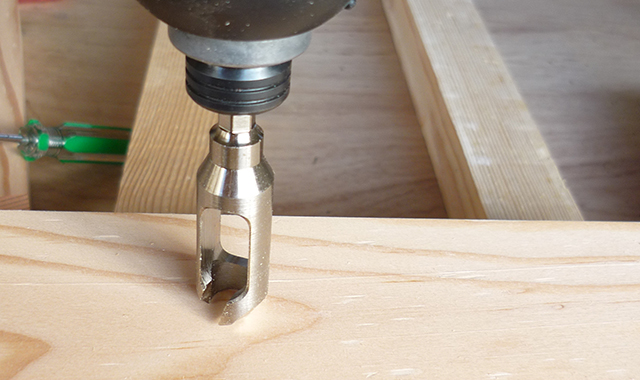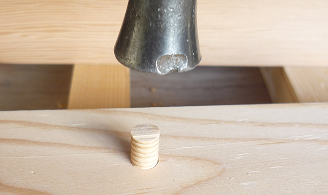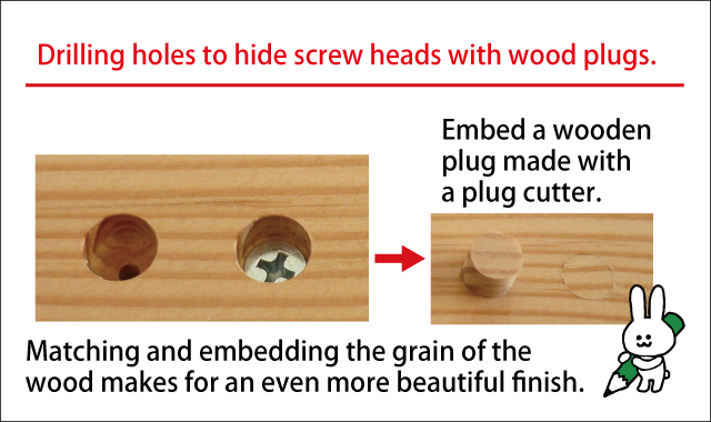 Pre-drilling and countersink processing are performed with a countersink, and a wooden plug is made with a plug cutter.