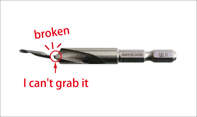 The inner drill has broken off, but the remaining part is too short to grab and pull out.