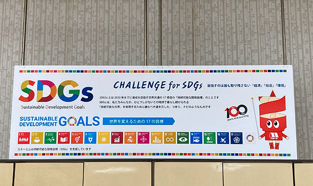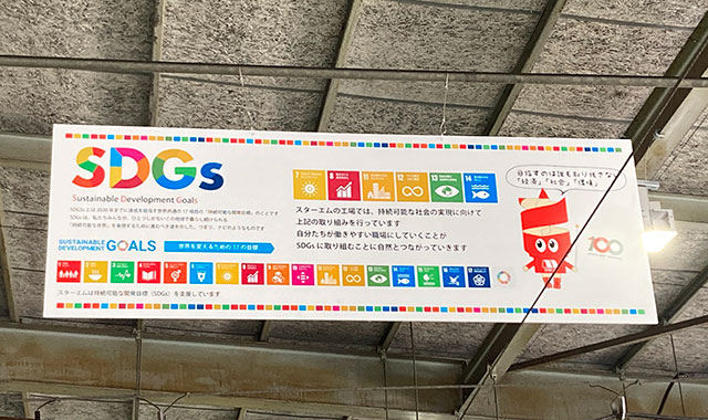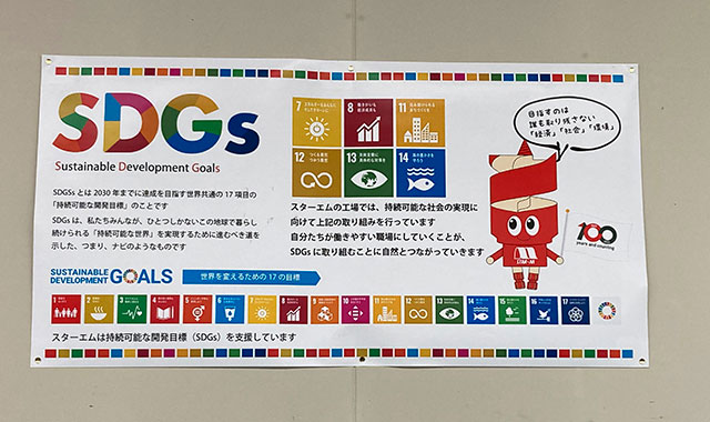 SDGsに取り組んでいくことが、自分たちの住む町や働く環境がより良くなっていくことにつながります。その為にはひとりひとりが日頃から意識することが大切です。スターエムでは全社員がSDGsを身近なものとして意識できるよう掲示やモニターにて情報発信を行っています。