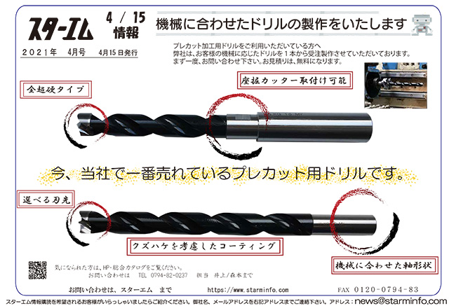 ご要望に応じたプレカット用ドリルの製作を1本からいたします