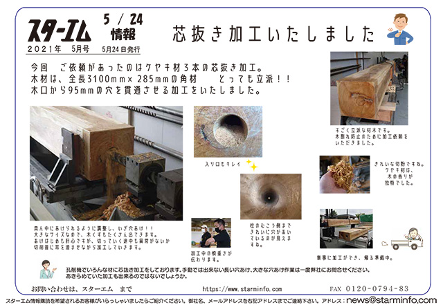 全長3100mmのケヤキ材の芯抜き加工をおこないました