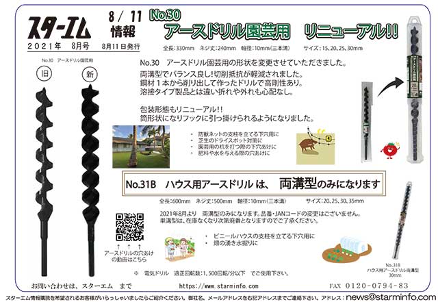 アースドリル園芸用のパッケージがリニューアル!ハウス用アースドリルは両溝型のみになります