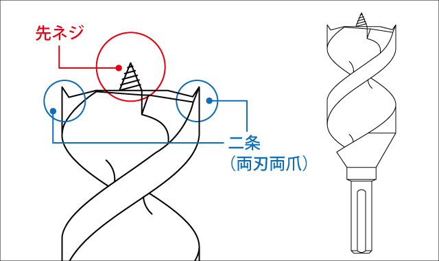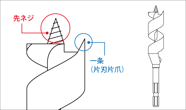 穴あけの際、ドリルの回転円周に沿って材の繊維(木目)などをケガキながら進む刃(爪)です。