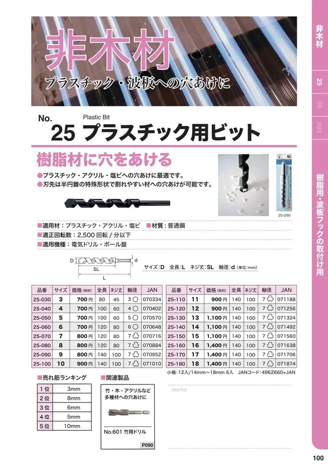 - 刃先は半円錐の特殊形状でプラスチックやアクリル等に簡単にきれいな穴あけができます