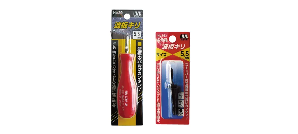 - 錐先が鋭く滑りにくいので位置決めがカンタン、波板の山の部分にも穴あけがしやすいです