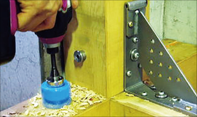 ③込栓(ブッシュ)取付け穴の座掘作業が終了したら込栓(ブッシュ)とアングルを取付ける