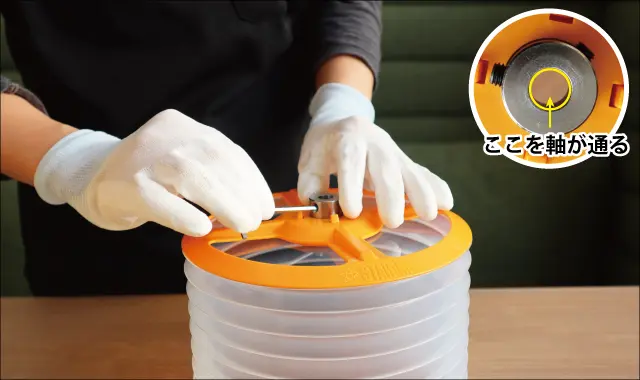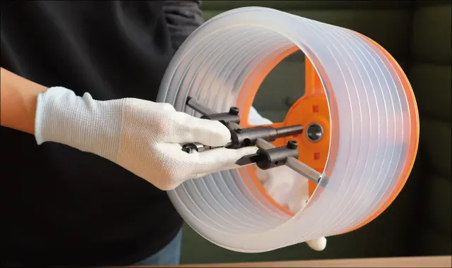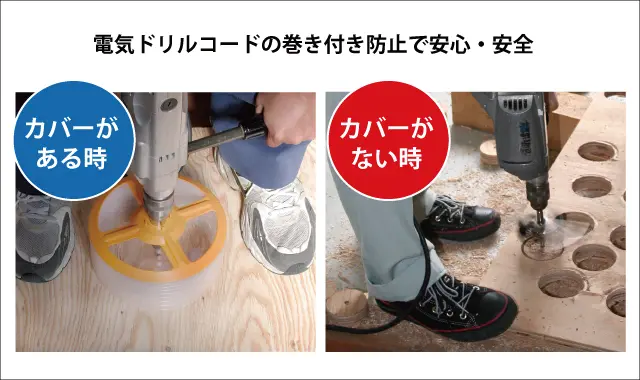 カバーがない時はブンブン回る自在錐がちょっと怖いなと思ったり、電気ドリルのコードが巻き付いたりする心配があります。あんぜんカバーがあれば自在錐を覆ってくれるので安全・安心です。