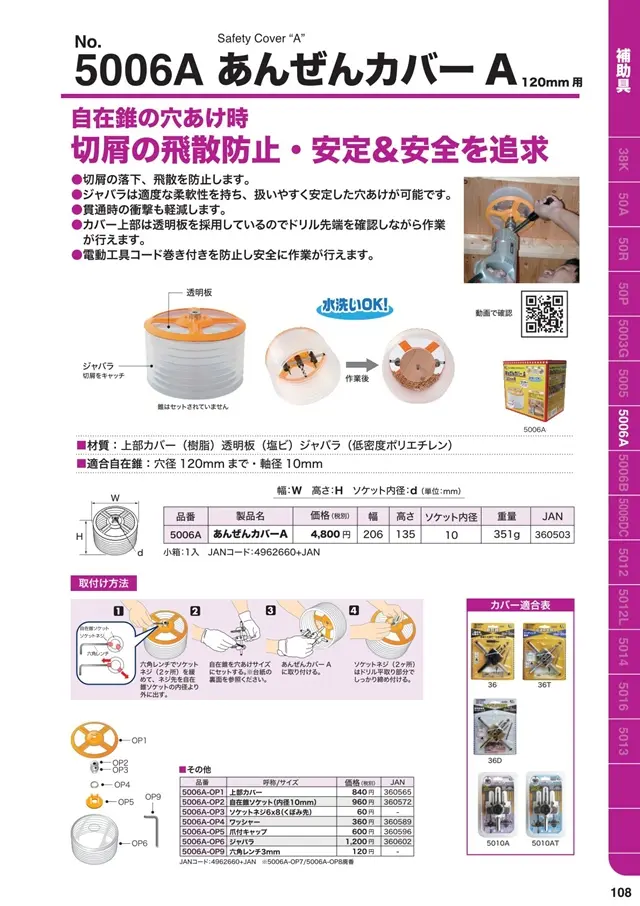 - No.5006A あんぜんカバーAにNo.36X 充電ドリル用自在錐をセットする場合は、別売の「ソケット」と「主軸」が必要です。