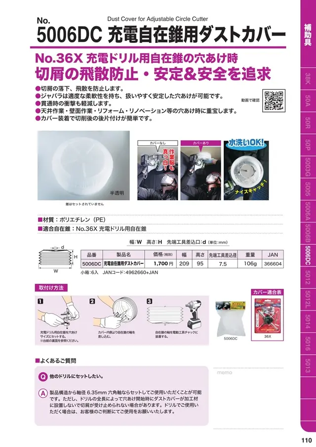 - 製品の構造面からみると6.35mm六角軸のものでしたらセットしてご使用いただくことは可能ですが、ドリルの長さによっては穴あけ開始時にダストカバーが穴あけ材に接地しないので切屑が受け止められない場合も生じます。その為メーカーとしましては適用機種は充電ドリル用自在錐とさせていただいています。もし、他のドリルでご使用いただく場合はお客さまのご判断にてご使用をお願い致します