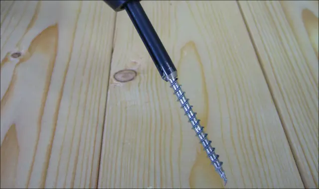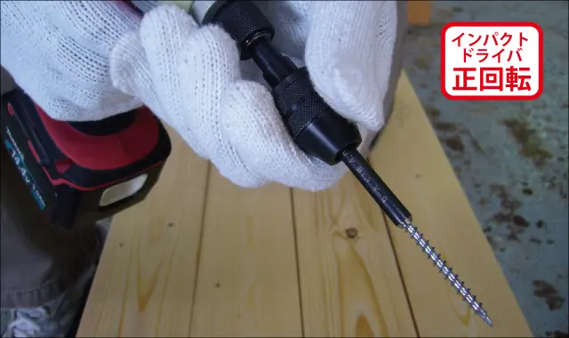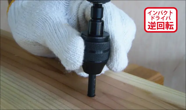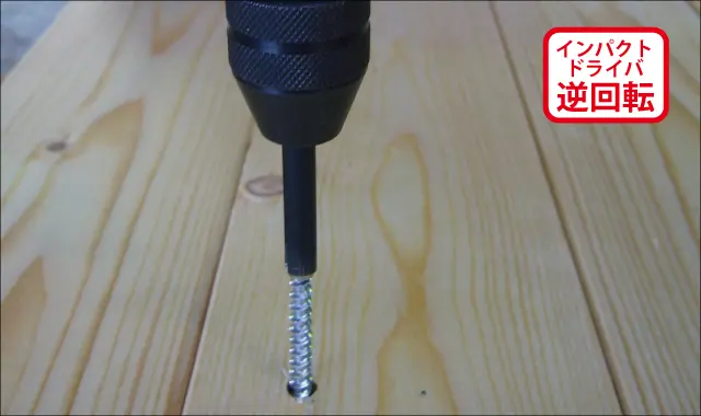 ④インパクトドライバを逆回転で回すと折れ込んだビスが材から抜けてきます