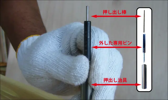 ⑦下から押出し治具、外した専用ピン、押出し棒の順にセットし、押出し棒を叩き込むと専用ピンからビスが外れます