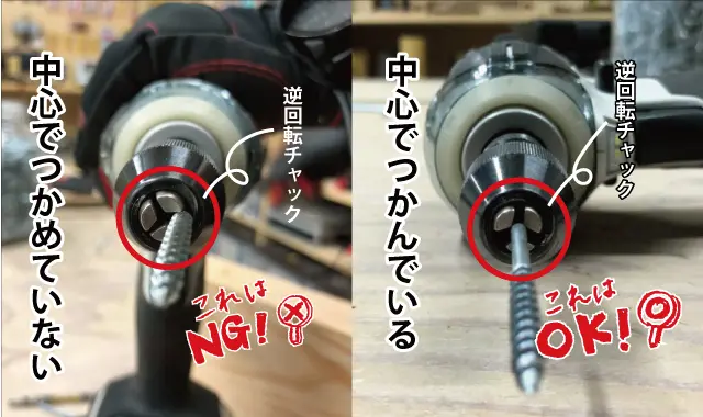 - 折れたビスや専用ピンは逆回転チャックの爪の中心でつかんでください。ずれた状態でつかむと破損する場合があります
