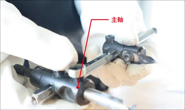 写真のように軸が折れてしまった時は「主軸」を交換していただくと継続してお使いいただけます。