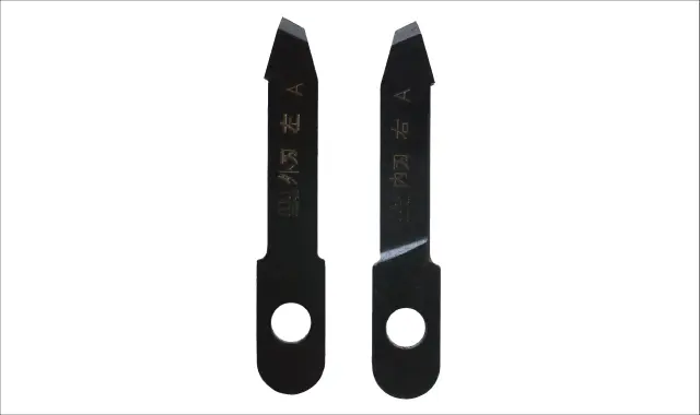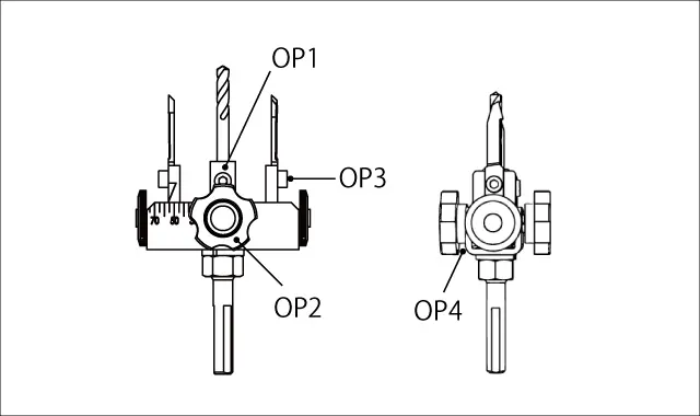- 替刃には刻印が印字してあります。アジャスト自在錐をセンタードリル止めネジが上になるようにして置きます。替刃の外刃、内刃をそれぞれ印字面が右になるようにセットします。