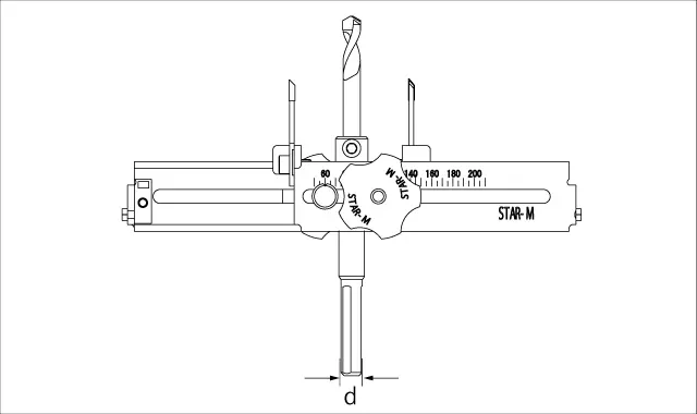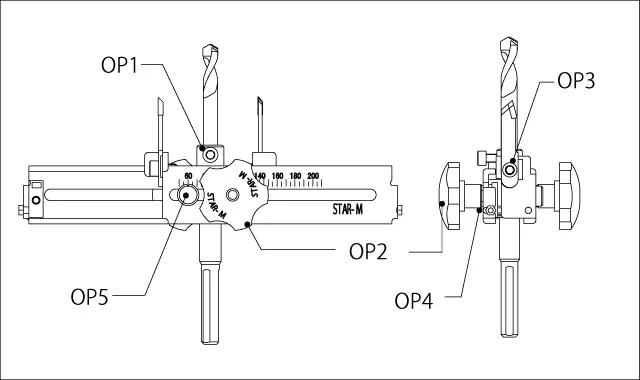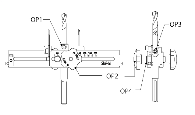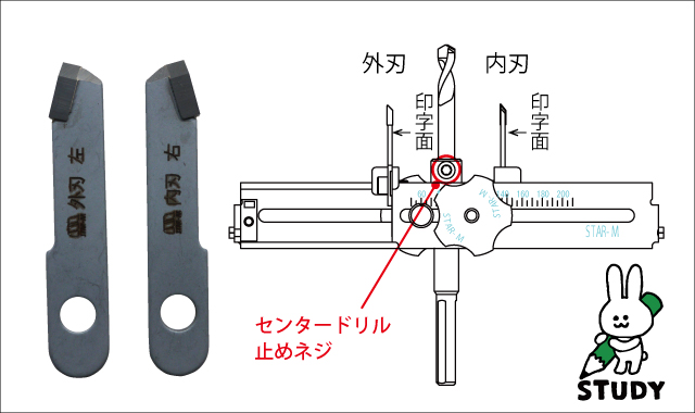 - 替刃には刻印が印字してあります。超硬ワンタッチ自在錐をセンタードリル止めネジが上になるようにして置きます。替刃の外刃、内刃をそれぞれ印字面が右になるようにセットします。