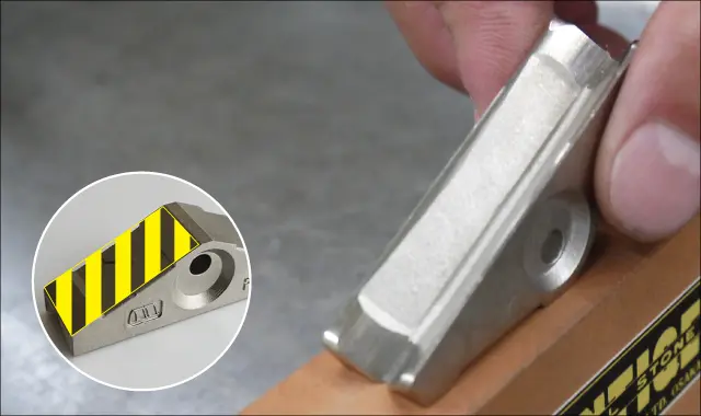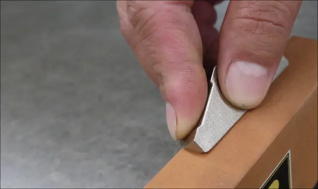④バリが出ている場合は、化粧テープをカットする要領で軽く砥石をあてます