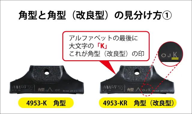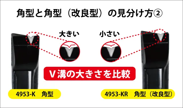 V溝の大きさで見分けます。角型でも削り過ぎるという場合に角型(改良型)を使うので、V溝が小さいのが角型(改良型)となります。