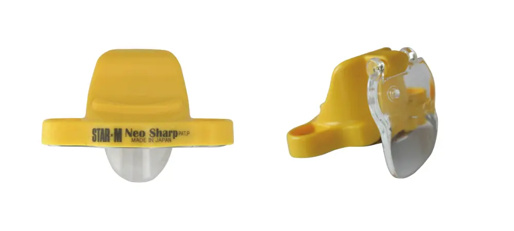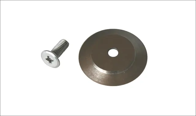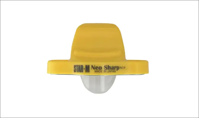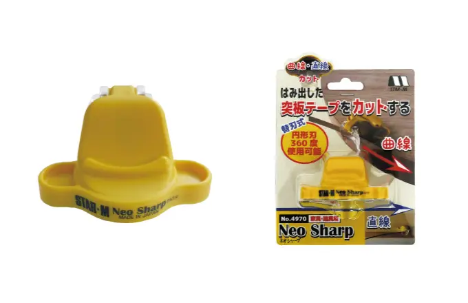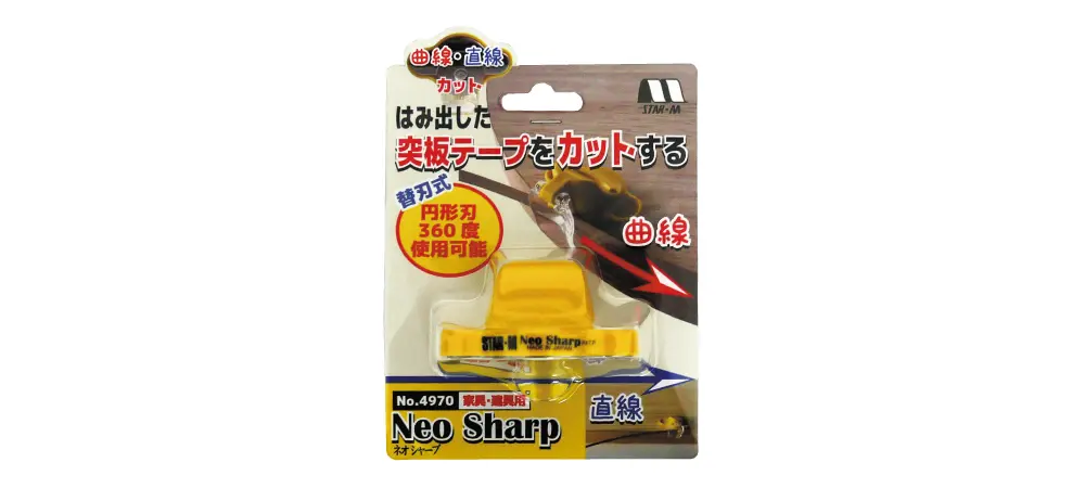 円形刃は360度使用可能です。固定ネジを緩めて刃を少し回転させて未使用部分に合わせて固定ネジを締め直します。ぐるりと1周使い切った時は新しい刃をお求めください。 - 突板(ツキイタ)は希少性の高い美しい木目を持つ木材を薄く(0.2mm~3mm)スライスしたものです。この薄い突板を合板などの板に貼り付けることによって美しい木目をいかした木材を製造することができます。この突板をテープ状にしたものを「突板テープ」と呼びます。割れ、反り、ねじれ、汚れ、色やけが少ないのも特長です。Neo Sharpはこの「突板テープ」をカットする製品です。