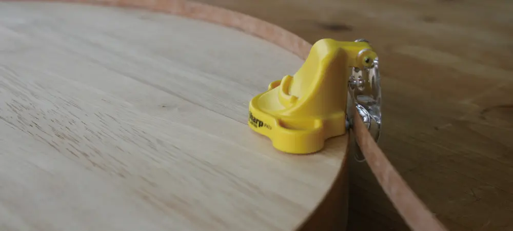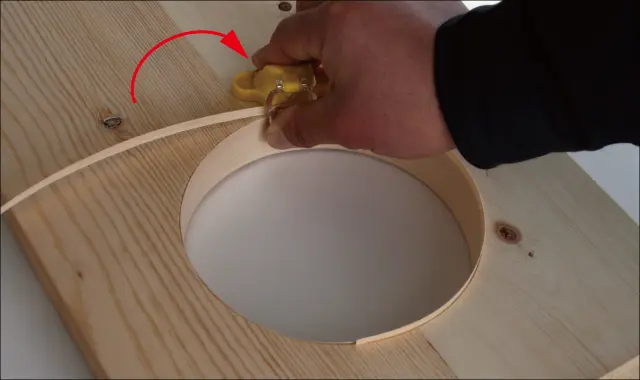 はみ出した突板テープをクリップと刃(円形刃)でしっかりと挟み込み、母材の上をスライドさせます