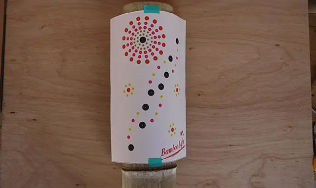 ①竹にデザイン紙をマスキングテープで仮止めします。デザインはチョークなどで竹に直接描いてもOKです。