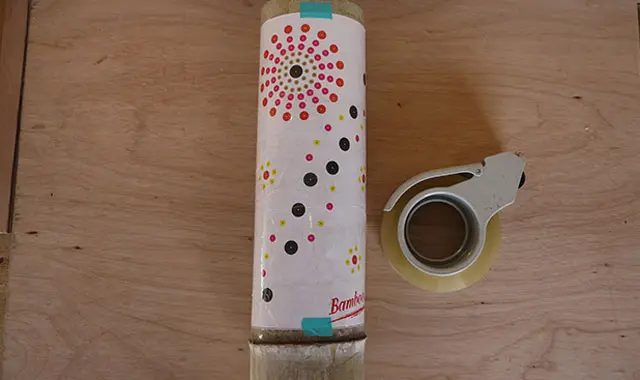 ②透明テープでデザイン紙を竹に貼り付けます。テープは部分的ではなく、隙間がないように全体に貼ってください。
