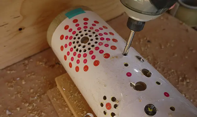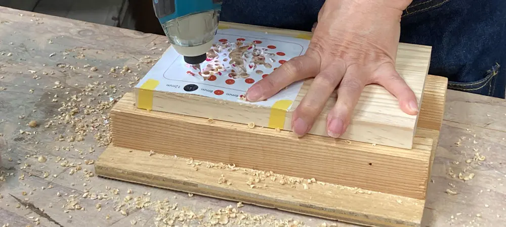 ③固定用の台に竹をセットし、竹用ドリルで穴をあけていきます。竹が動かないようしっかり固定して穴をあけてください。