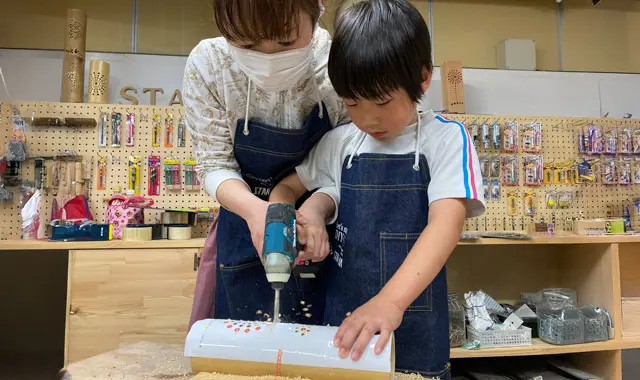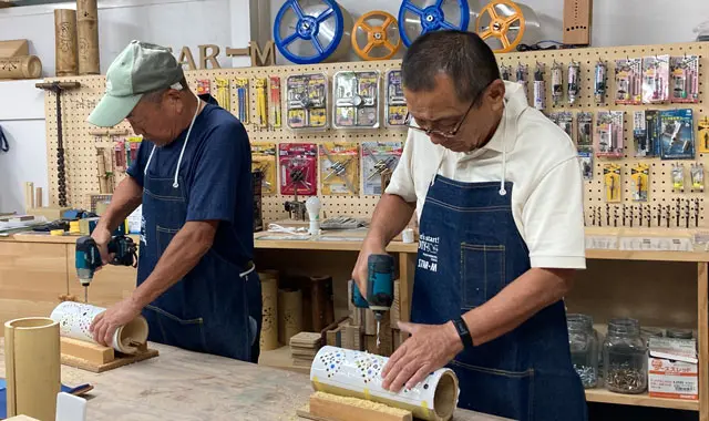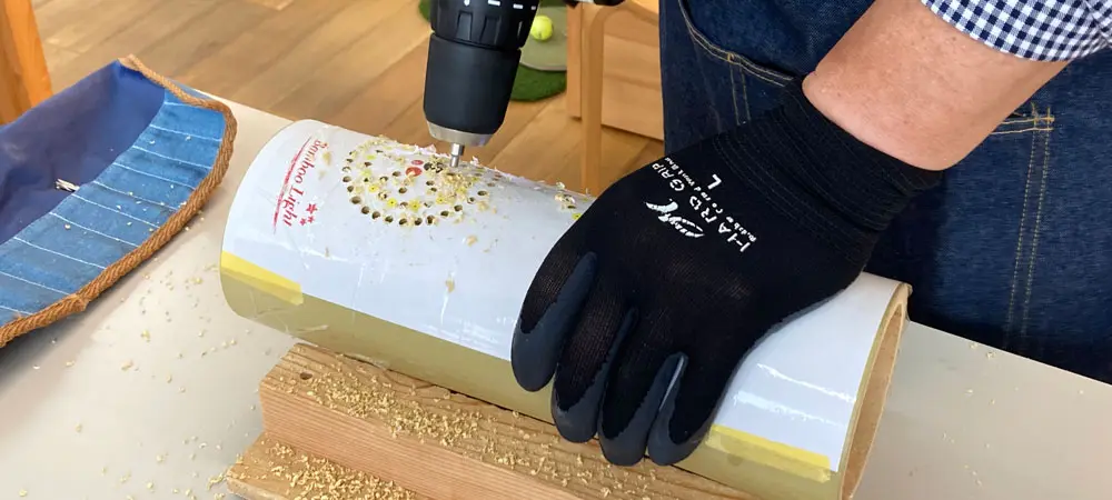 ワークショップでは竹用ドリルを使用します。お子さんから大人まで、はじめて穴あけをする人でも使いやすいドリルなのでみなさんに穴あけを楽しんでいただいています。