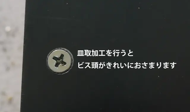 【皿取加工】皿取加工を行うことで、ビス頭がきれいにおさまり美しい仕上がりになります