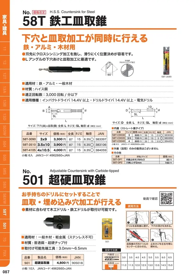 No.58T 鉄工皿取錐/ H.S.S. Countersink for Steel