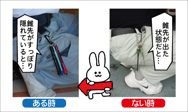 しゃがんだ時に腰にぶら下げた錐が足に刺さってしまって痛かった、そんな経験はありませんか?ドリルホルダーは錐をすっぽり収納できるので足に刺さる心配がなくて安全です