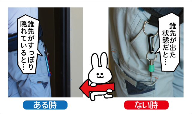 腰に錐がぶらさがった状態で体の向きを変えた時に、錐先が化粧材にあたってしまって傷つけてしまった経験はありませんか?ドリルホルダーは錐をすっぽり覆うことができます。しかもソケット部分はエラストマー(ゴム)なので傷がつきにくいので安心です