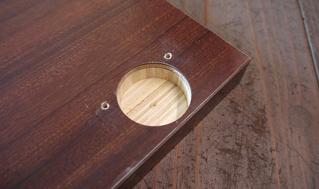 ②扉にスライド丁番のカップ径に合わせて超硬丁番で穴あけを行い、ネジの下穴もあけておく