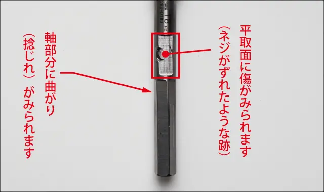 このような状態になってしまう原因はネジの緩みです(軸貫通式タイプの場合)。ガイドやドリルを交換した際にネジがしっかりと締まっていない状態で作業をした場合にこういったことが起こりやすくなります。